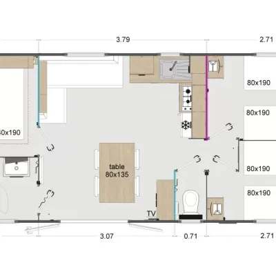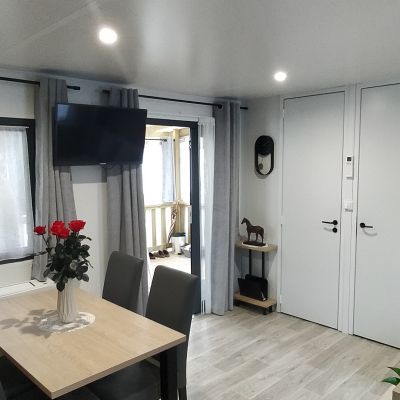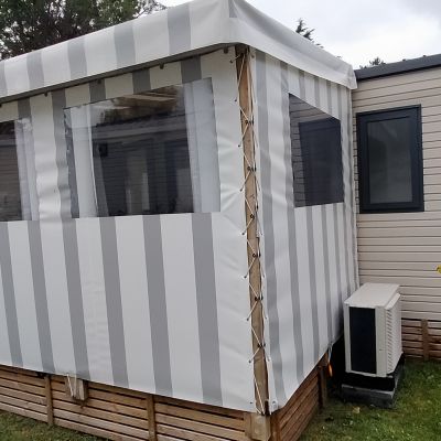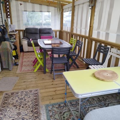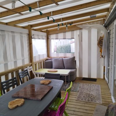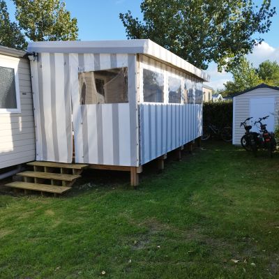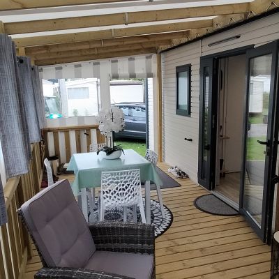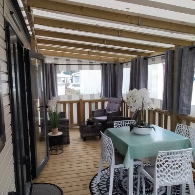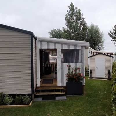 Chaque mobil-home est installé avec une terrasse du lys de 4,5x2.5m. vous avez également la possibilité d'ajouter une couverture totale ou partielle, des joues ou façade et toutes autres options disponibles.